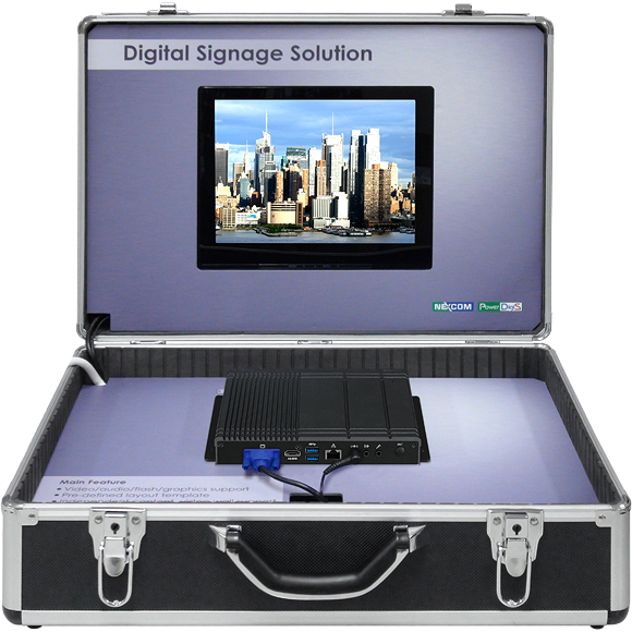 Digital Signage Solution starter kit includes PDSB 325 with preloaded PowerDigiS signage software. PowerDigiS is targeting for entry-level digital signage applications. PDSB 325 is enclosed in a compact chassis with low power consumption and can be easily integrated to display such as LCD TV or PDP at site installation. It works perfect for increasing digital signage applications within retail outlets, department stores, entertainment venues, restaurants, hotels, bus/train stations, schools/universities and hospitals for dynamic message, delivering, advertising, or brand promotion.