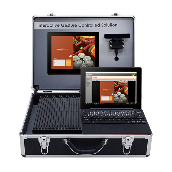 Interactive Gesture Controlled Solution includes NDiS B535, Intel® RealSense camera, 10.1” tablet, Gesture control software. People standing in front of the electronic menu can easily use finger gestures to place meal order by clicking on the air. IT manager can monitor and access system remotely with the assistance of Intel® iAMT to greatly reduce on-site visit for technical support.
