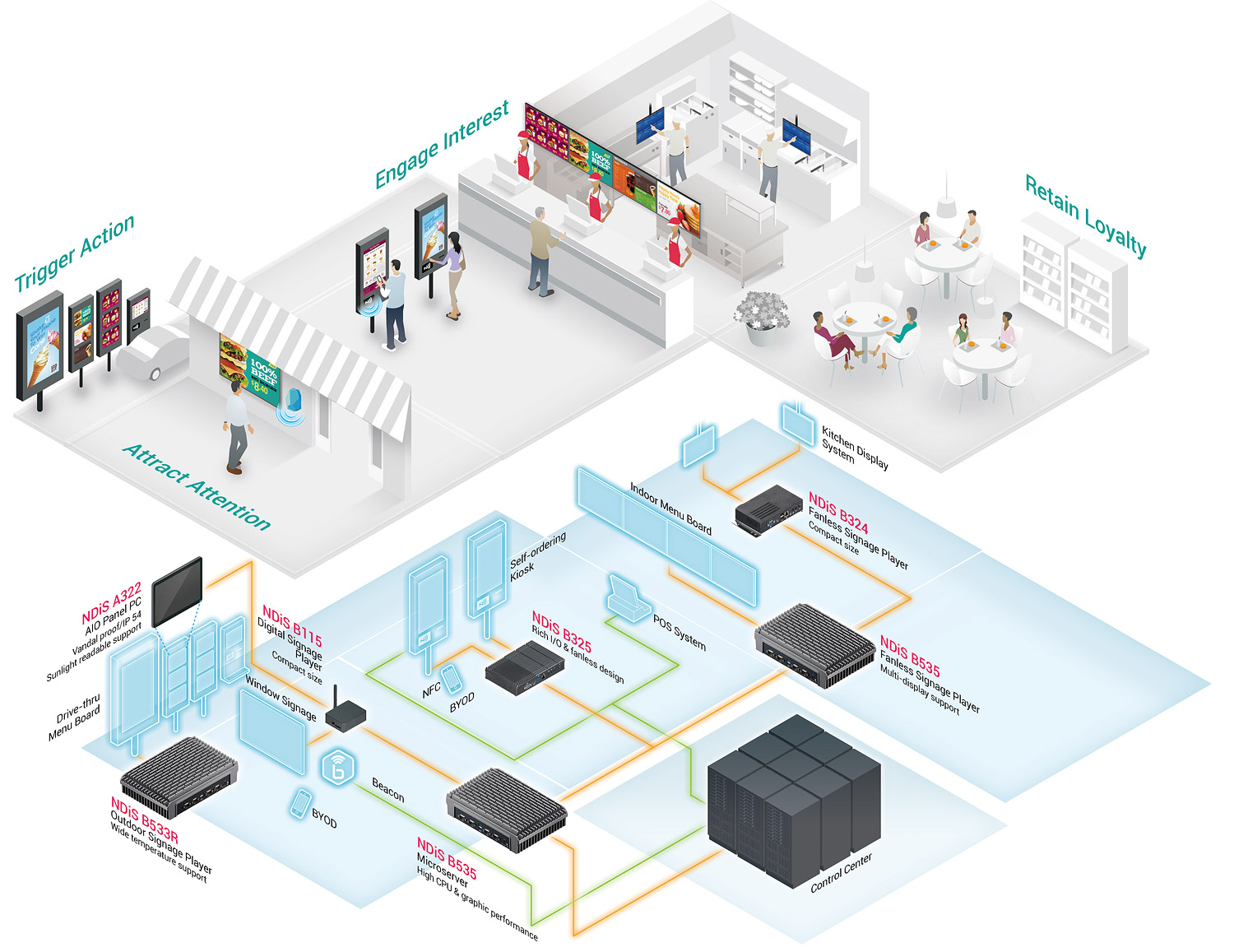 NEXCOM's digital signage solutions target QSRs with easy maintenance and cost efficiency to improve productivity and efficiency; this ultimately improves revenue and return on investment (ROI) for businesses. NEXCOM's managed digital signage network gives operators the flexibility and simplicity to control individual display, or as a tiled video wall from a centralized server. Furthermore, NEXCOM digital signage solutions come with standard 2 year warranty and optional extended warranty for up to 5 years. As a global company, NEXCOM can provide the necessary technical support from global software partners and installers with total solutions that benefit businesses across the board.
