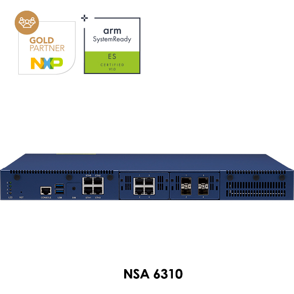 1U rackmount uCPE NSA 6310, powered by the NXP® Layerscape® LX2160A SoC processor, helps telecom companies build virtualized environments and edge applications. This appliance combines sixteen ARM® Cortex®-A72 processor cores with high-performance data path accelerators for networking and telecom/enterprise uses. It features a flexible I/O networking design to supports up to 10Gb Ethernet connectivity, together with leveraging FPGA or GPU cards for edge computing.