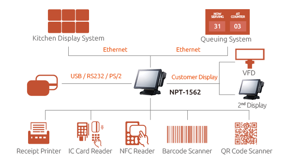NEXCOM NPT series of POS terminals are intended for food & beverage, QSR, hospitality, and CVS retail industries. The NPT series of POS terminals has low power consumption and requires minimal maintenance. The NPT series comes with a removable HDD, MSR, fingerprint and VFD kit. The NPT series has a small footprint ideal for space-saving installations.
